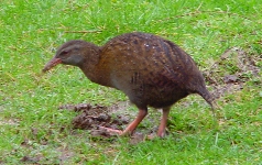 Wekas (Gallirallus australis) are an endangered flightless bird, slightly smaller than the kiwi. The Islands of New Zealand have been remote from any major landmass for millenia so the native wildlife consisted of creatures which could fly or swim here - there were no mammals here besides bats and seals until the first arrival of humans possibly only about 1600 years ago. In the absence of mammalian predators, many species of ground-foraging bird lost the redundant ability to fly - some Moa stretched to over 3metres (10 foot) tall.   The first people here brought with them dogs and rats. When europeans arrived they brought cats, rats, ferrets, weasels, stoats, and possums. Most native flightless bird species were soon extinct. Of the four remaining, 2 are extremely rare, and the Kiwi is steadily declining (see my Kiwi Rant).